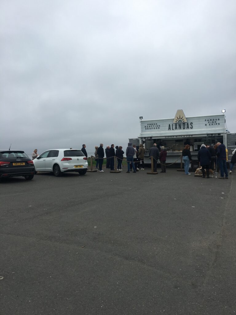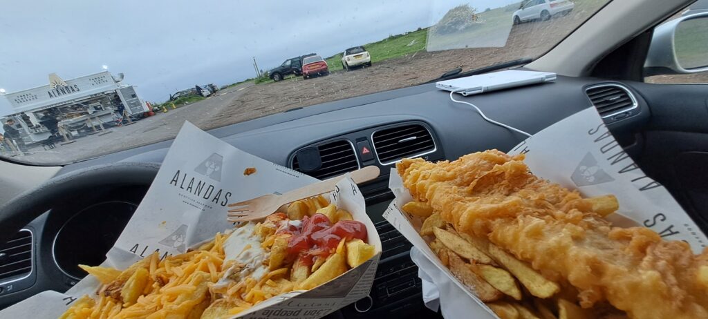 Unser nächstes Etappenziel war ein Stellplatz direkt am Strand 25 km vor Edingburgh. Zu unserem Glück war dort ein Imbissstand.
