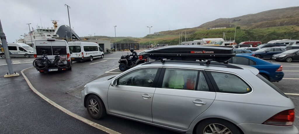 Als alle fix gebuchten Fahrzeuge auf der Fähre waren, hörten wir durch unsere geöffneten Fenster den Funkspruch: “the car, not the van”. Der Hafenmitarbeiter stoppte per Handzeichen den Van und deutete uns, dass wir auf die Fähre fahren sollen. Genüsslich fuhren wir bei unseren Freunden aus dem nahen Norden vorbei und parkten Herr Müller am Autodeck.