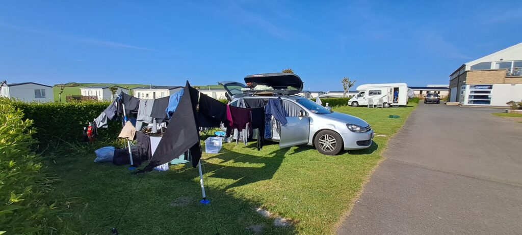 Da sich die Schmutzwäschesäcke bereits stapelte, beschlossen wir auch einen Waschtag einzulegen. Die gewaschene Wäsche haben wir auf der selbstgebauten Wäscheleine getrocknet.